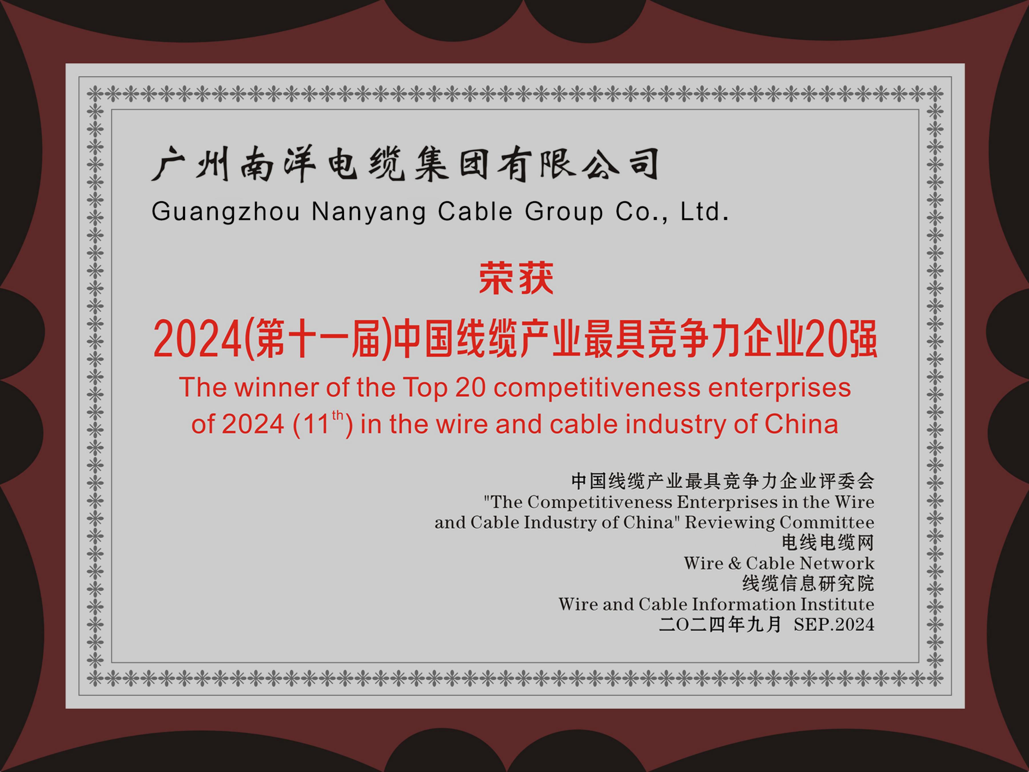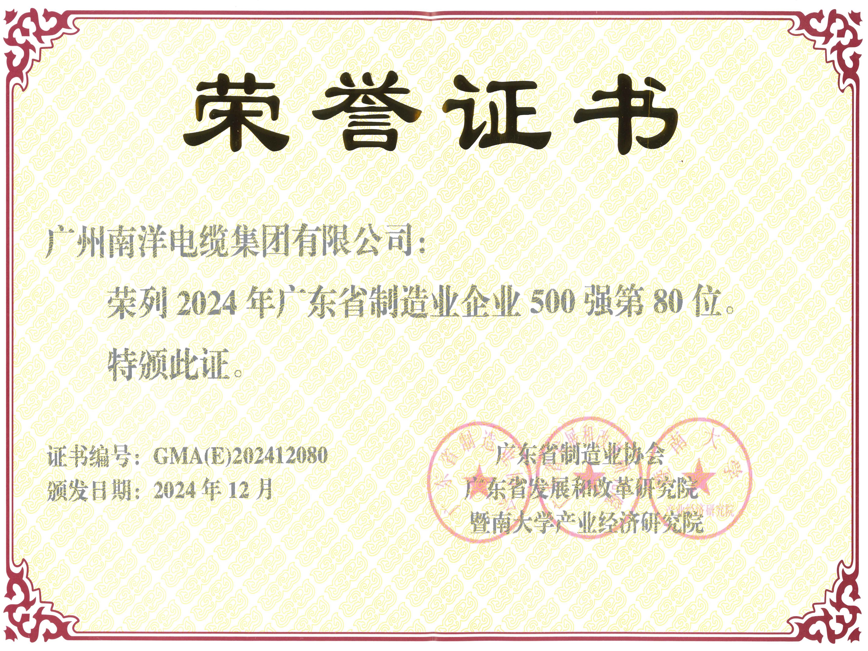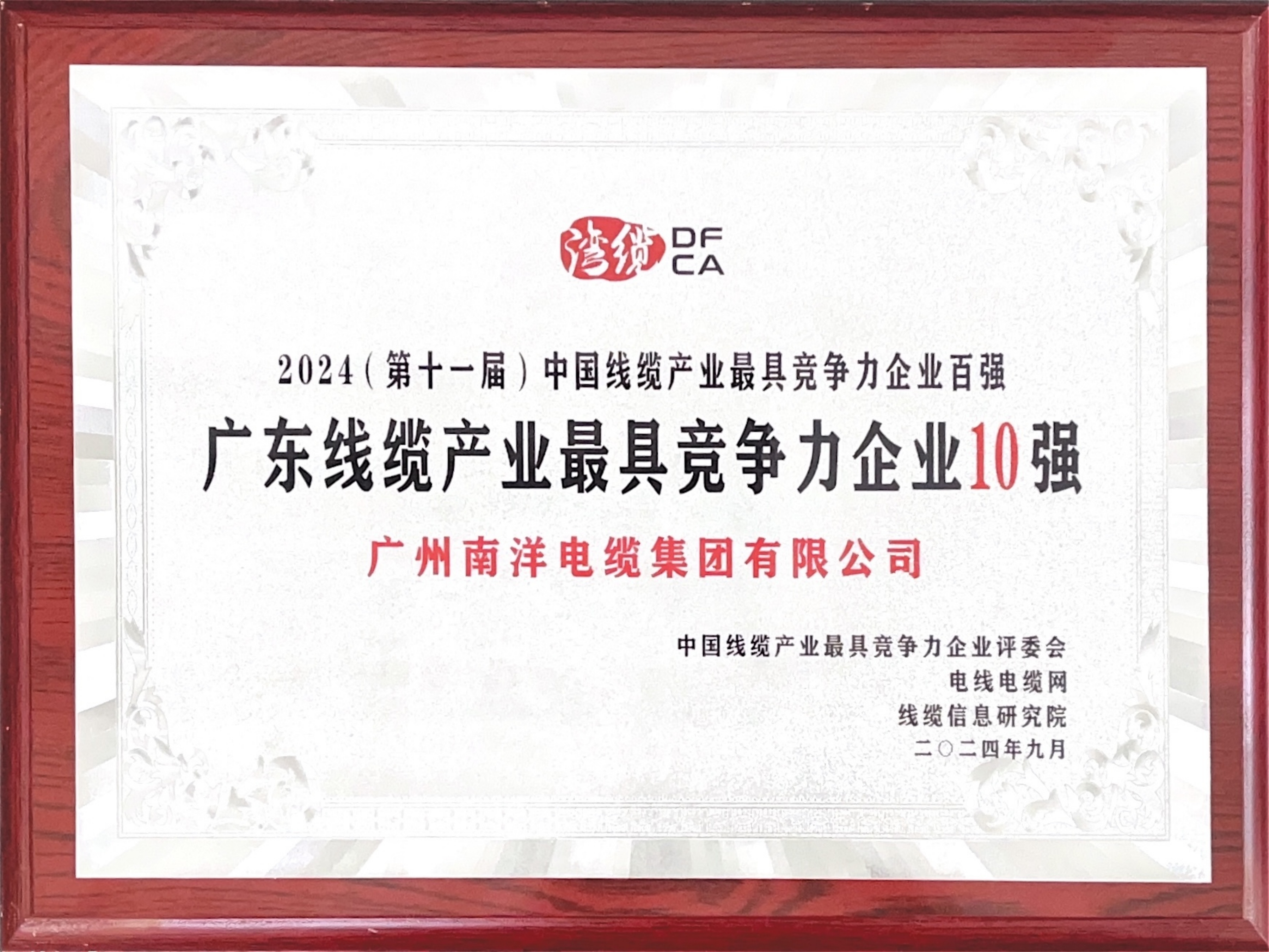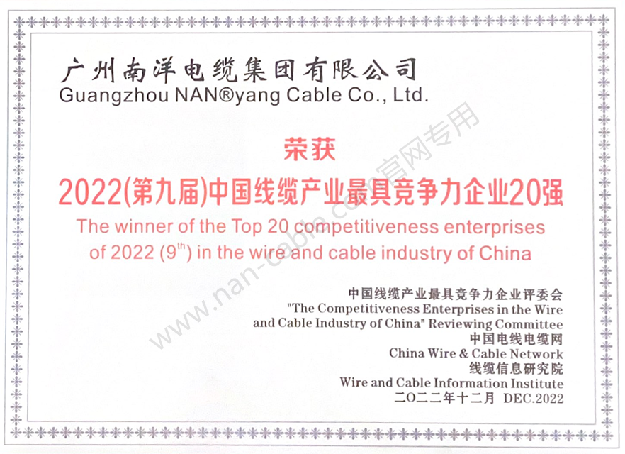 廣東線纜行業最具競爭力企業第一名、中國線纜行業最具競爭力企業20強、華南地區電線電纜研發制造龍頭企業